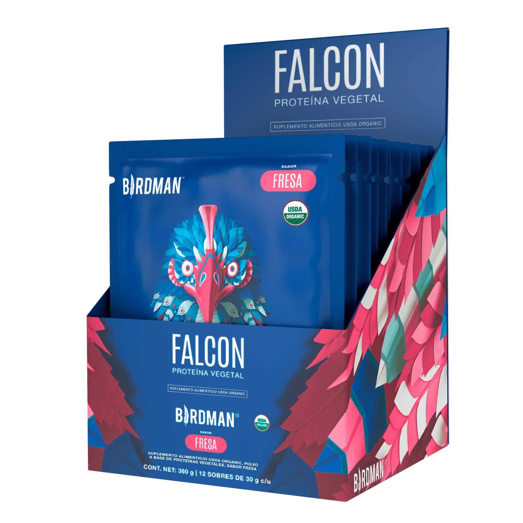 Falcon Protein está diseñada para apoyar tu ingesta de nutrientes diarios y está disponible en sabores orgánicos de chocolate, vainilla, chai, natural y fresa.