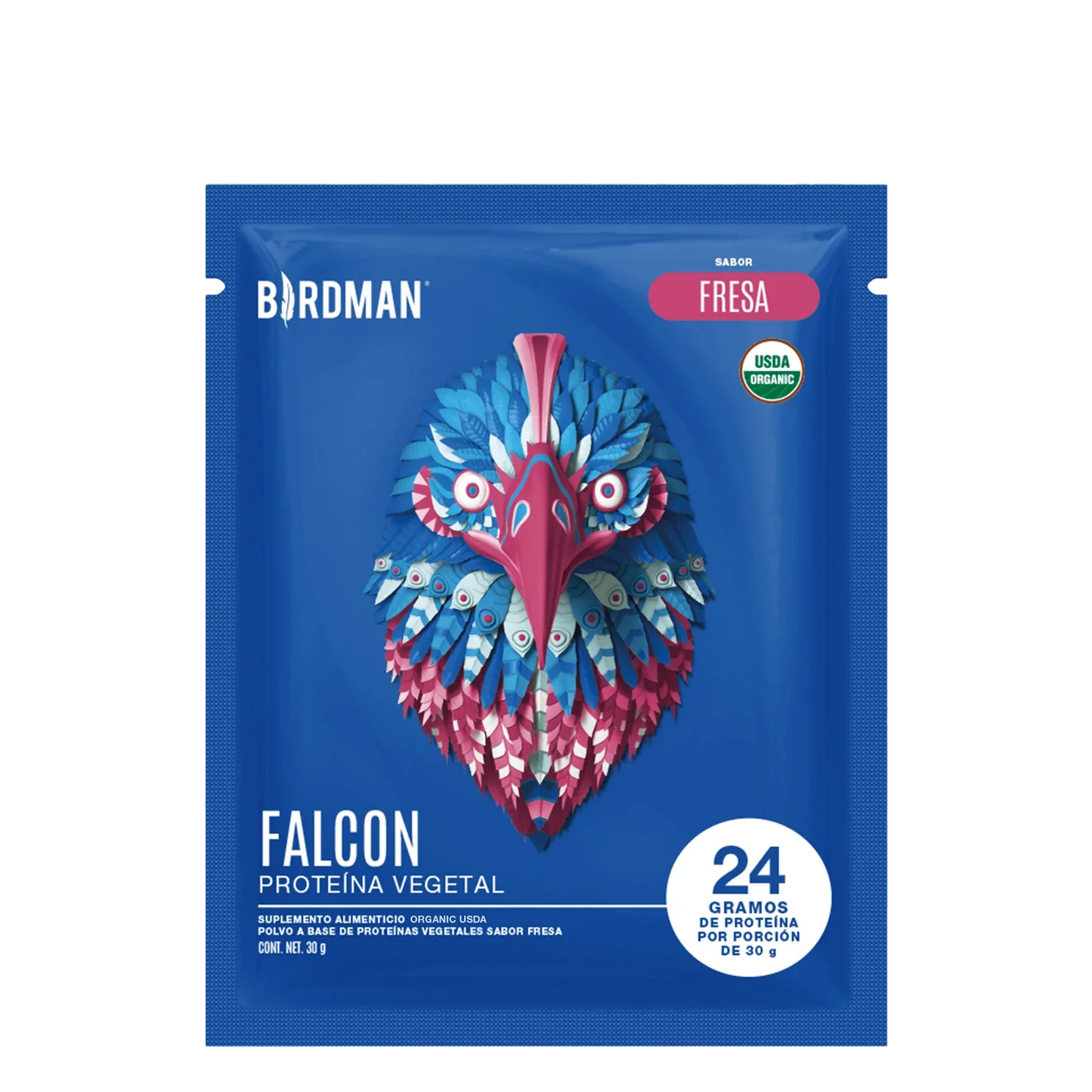 Falcon Protein está diseñada para apoyar tu ingesta de nutrientes diarios y está disponible en sabores orgánicos de chocolate, vainilla, chai, natural y fresa.