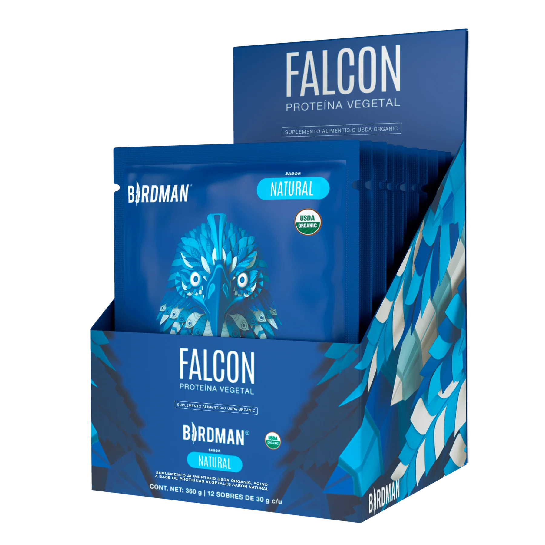 Falcon Protein está diseñada para apoyar tu ingesta de nutrientes diarios y está disponible en sabores orgánicos de chocolate, vainilla, chai, natural y fresa.