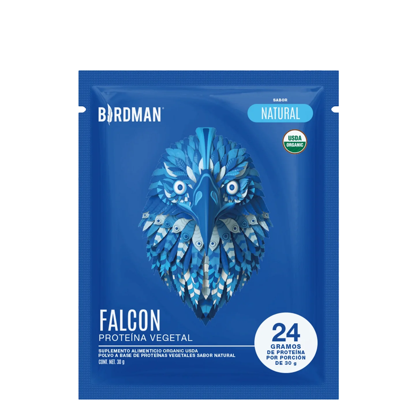 Falcon Protein está diseñada para apoyar tu ingesta de nutrientes diarios y está disponible en sabores orgánicos de chocolate, vainilla, chai, natural y fresa.