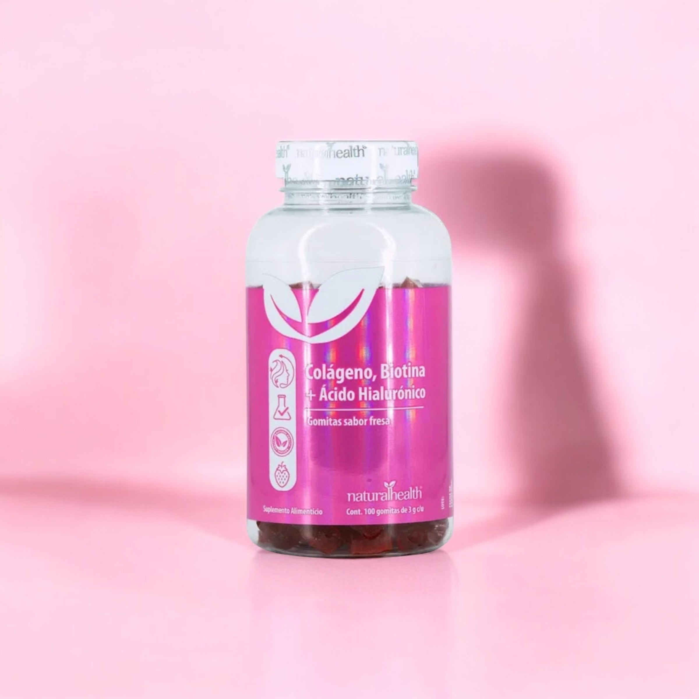 Colágeno Biotina Ácido Hialurónico 100 gomitas sabor Fresa Natural Health. CONT. 100 Gomitas de 3 g c/u MODO DE EMPLEO: Tomar 2 gomitas al día. INGREDIENTES: Agua Purificada, Azúcar, Glucosa, Grenetina, Pectina, Àcido Cítrico, sabor Fresa natural, Ácido Málico, Eritritol (0.91 g /100 g), Cera de Carnauba, MICOBEL-SR (sorbato de potasio, ácido sórbico, propionato de sodio y diacetato de sodio), extracto de fruto del monje, rojo FD&C #40. Colágeno Hidrolizado 0.2 g Biotina 292.50 μg Ácido Hialurónico 0.17 μg INSTRUCCIONES PARA SU CONSERVACIÓN: Consérvese en un lugar fresco y seco. Conserve bien cerrado el envase, protéjase de la luz y evite su exposición al calor a no más de 30˚C. *Las gomitas se pueden derretir por las altas temperaturas durante se trayecto de envío, no aplica devolución. ESTE PRODUCTO NO ES UN MEDICAMENTO. EL CONSUMO DE ESTE PRODUCTO ES RESPONSABILIDAD DE QUIEN LO USA Y DE QUIEN LO RECOMIENDA.