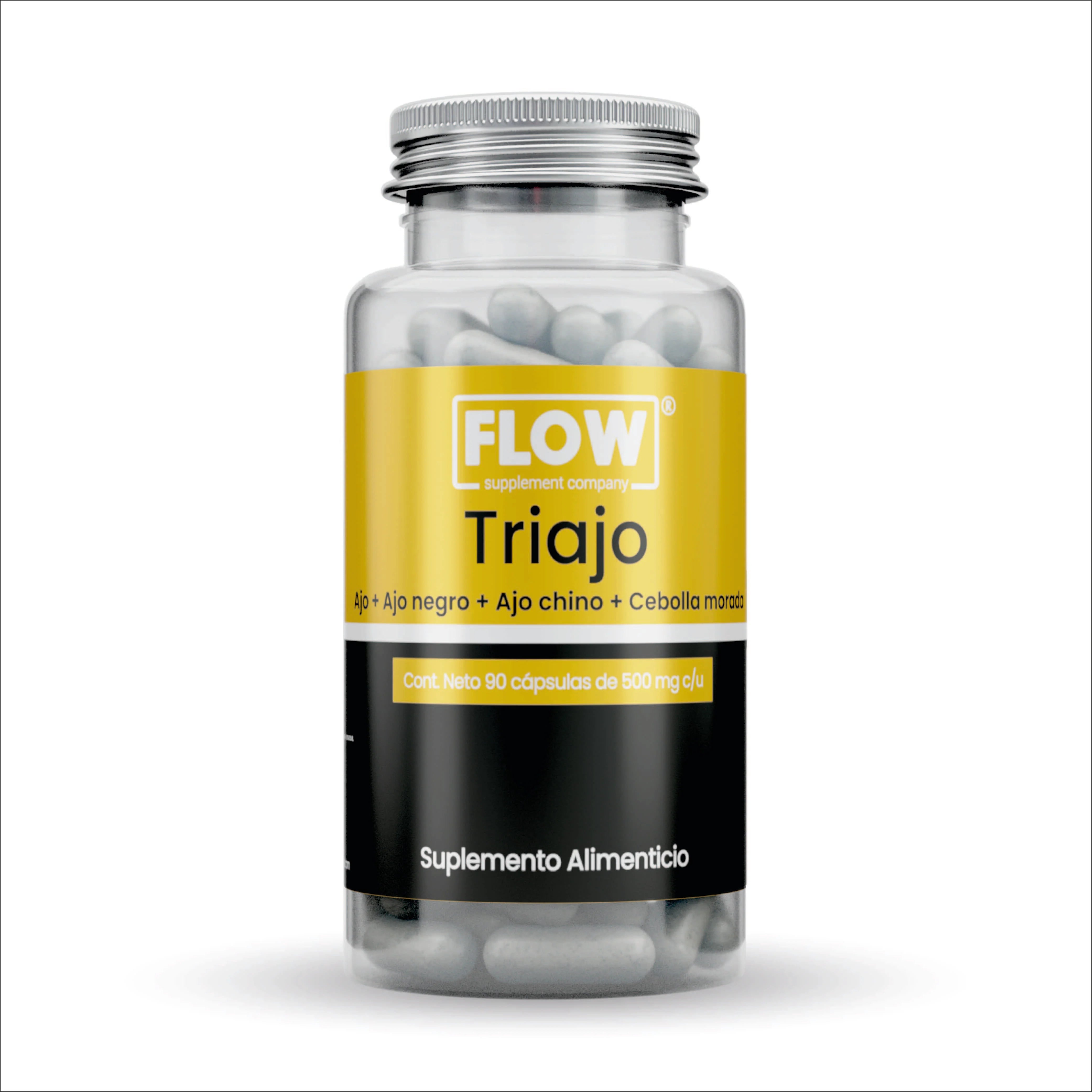 Suplemento a base de Ajo, Ajo chino, Ajo negro y cebolla morada; fórmula ideal para estas temporadas de frío. El Triajo de FLOW es libre de Gluten, y libre de aditivos. Contiene 90 cápsulas de 500 mg c/u.